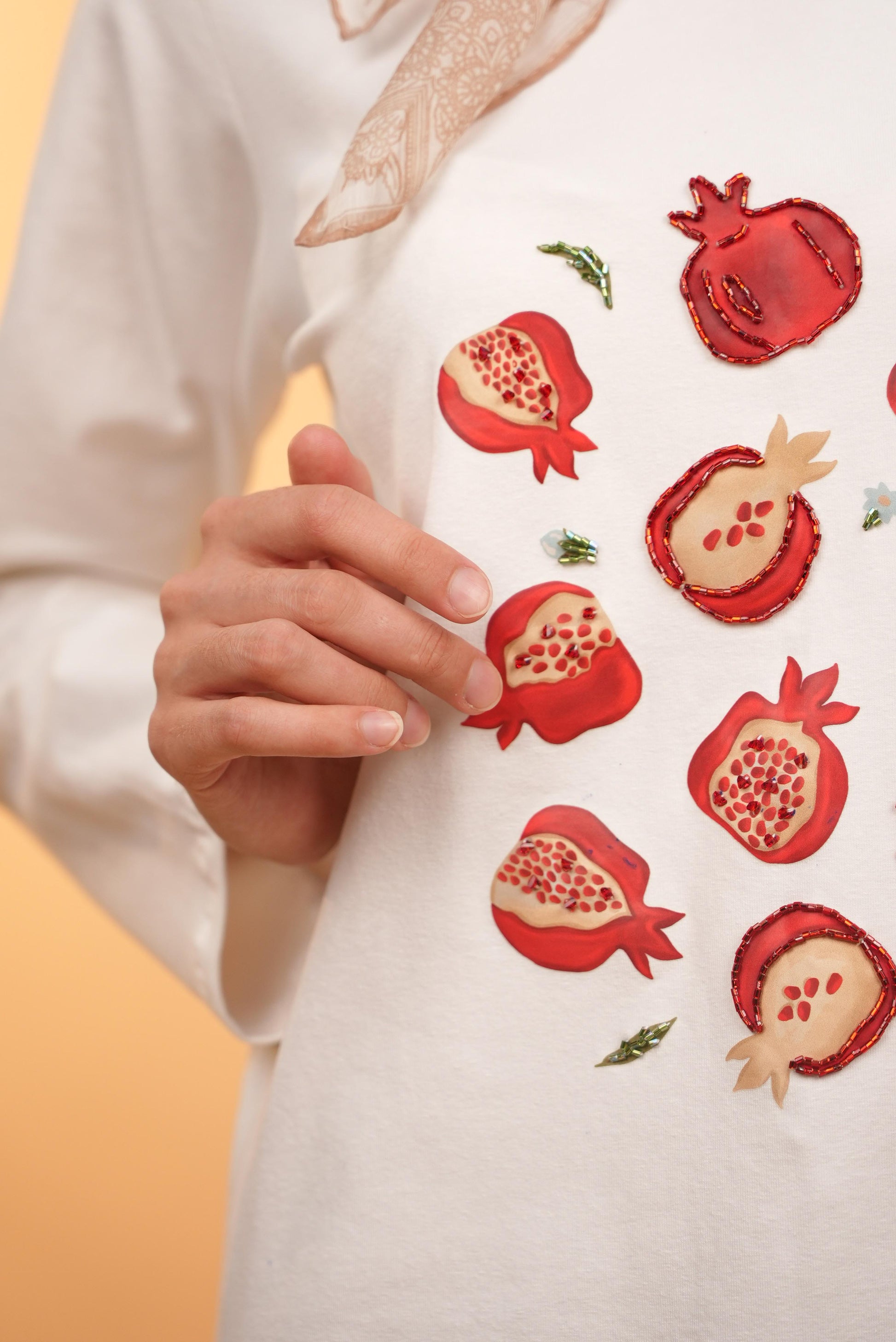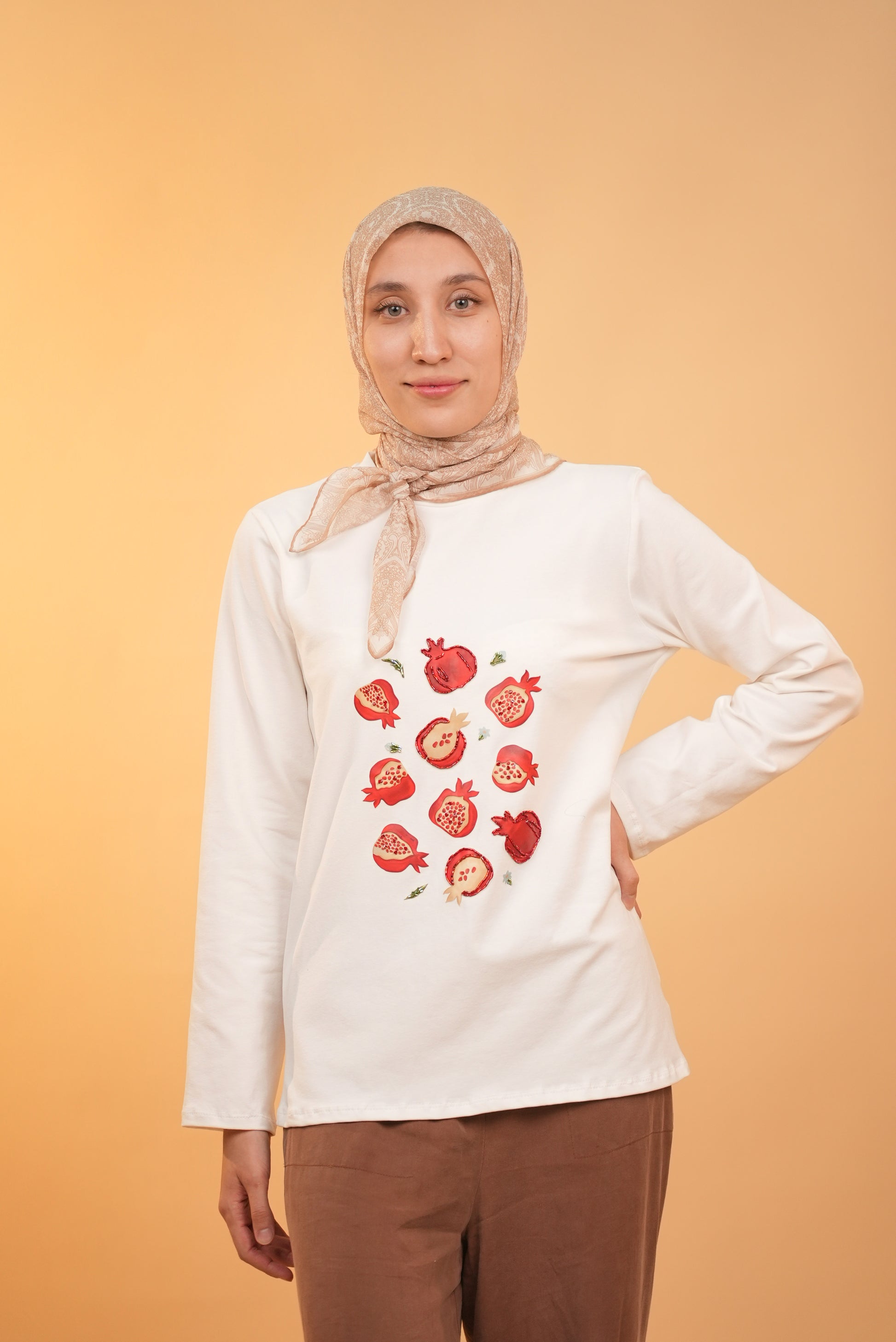 The Anor Garden – Ivory longsleeve is a celebration of comfort and style with a touch of cultural artistry. Crafted from 92% cotton and 8% elastane, it offers a breathable, soft feel with gentle stretch for all-day ease. The playful pomegranate embroidery on the front symbolizes abundance and joy, adding a lively detail to your everyday look. Perfect for pairing with casual or modest outfits, this versatile piece is available in sizes S, M, and L.