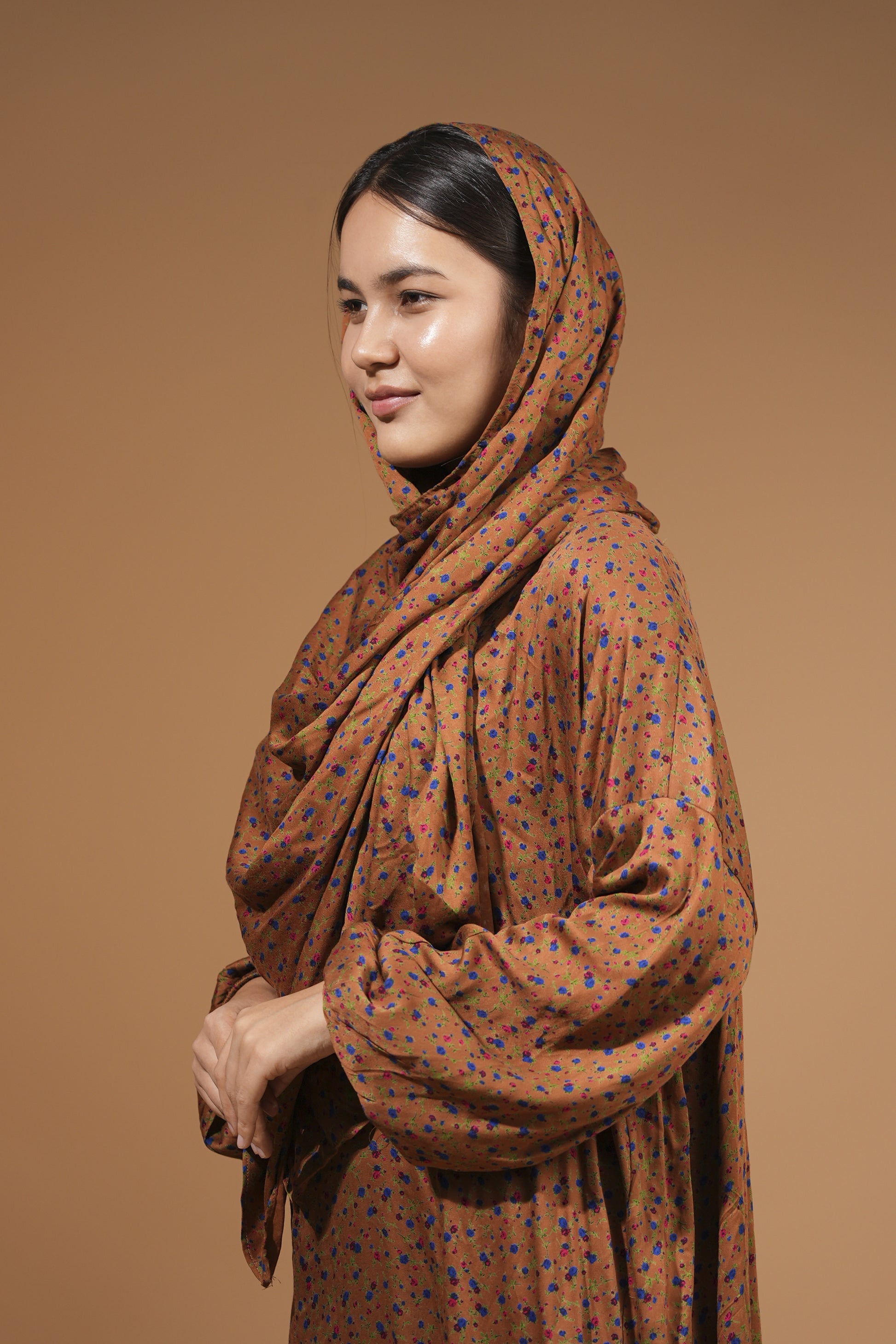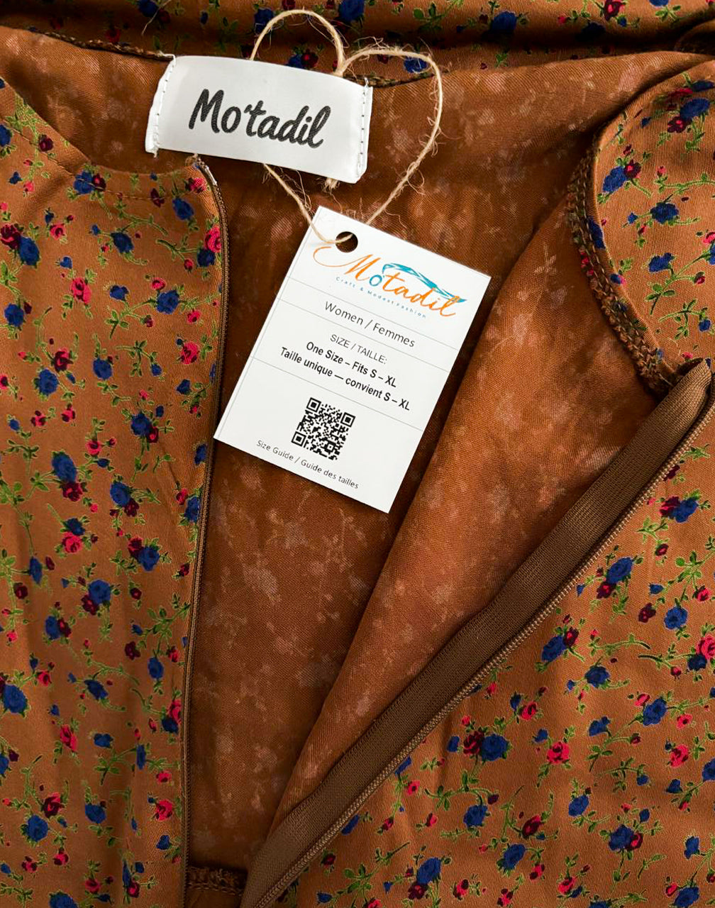 This brown maxi dress features a built-in scarf for effortless styling and full modest coverage. Designed with a relaxed fit, long sleeves, and a flowing silhouette, it blends everyday comfort with timeless elegance, making it suitable for both casual wear and special occasions.