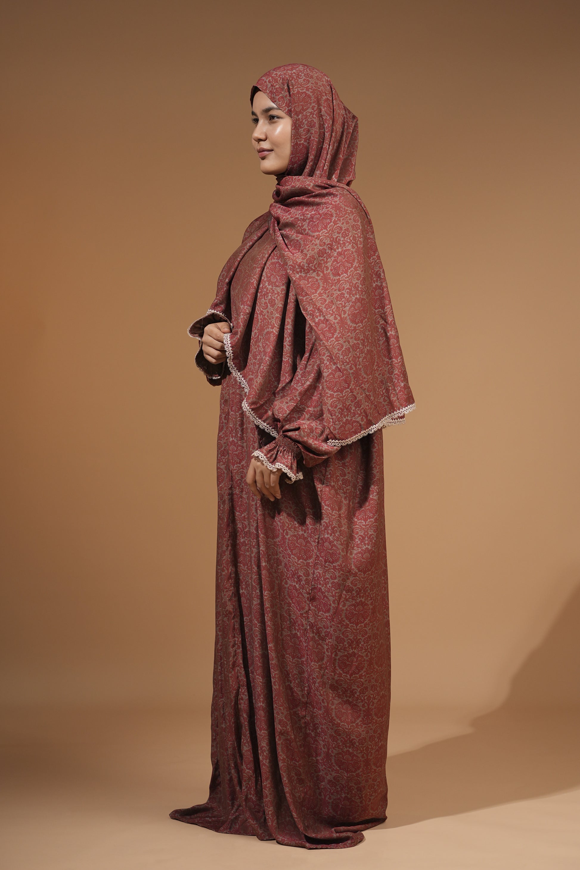 This maroon floral dress with a built-in scarf blends modesty and timeless elegance. Crafted from 100% lyocell, the fabric is lightweight, breathable, and eco-friendly, offering a soft and comfortable feel against the skin. The intricate floral pattern enhances its graceful design, while wide sleeves adorned with delicate lace trim add a refined and feminine touch.