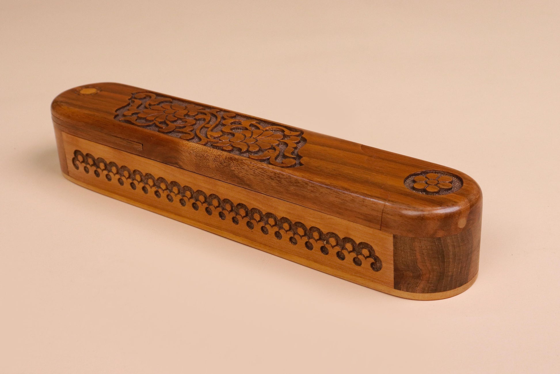 A beautifully hand-carved wooden décor box, crafted with traditional patterns and a smooth finish. Measuring 16 cm × 4.5 cm, this compact yet elegant piece is perfect for storing pens, jewelry, or small keepsakes. Beyond its intricate design and timeless charm, the box features a secret opening mechanism that adds an element of mystery and delight.