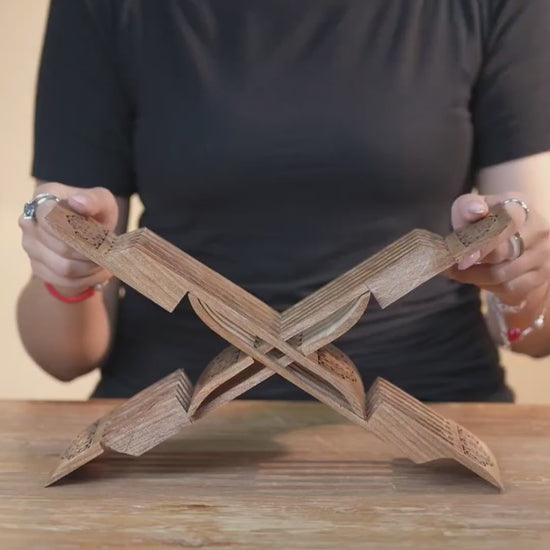 This beautifully handcrafted wooden bookstand combines elegance and practicality. Measuring 25.5 cm in width and 12 cm in height, it is compact yet sturdy—perfect for holding books or manuscripts. The intricate carved patterns add a touch of tradition, while the clever design allows it to transform into 4 different positions of varying height to suit your reading comfort.