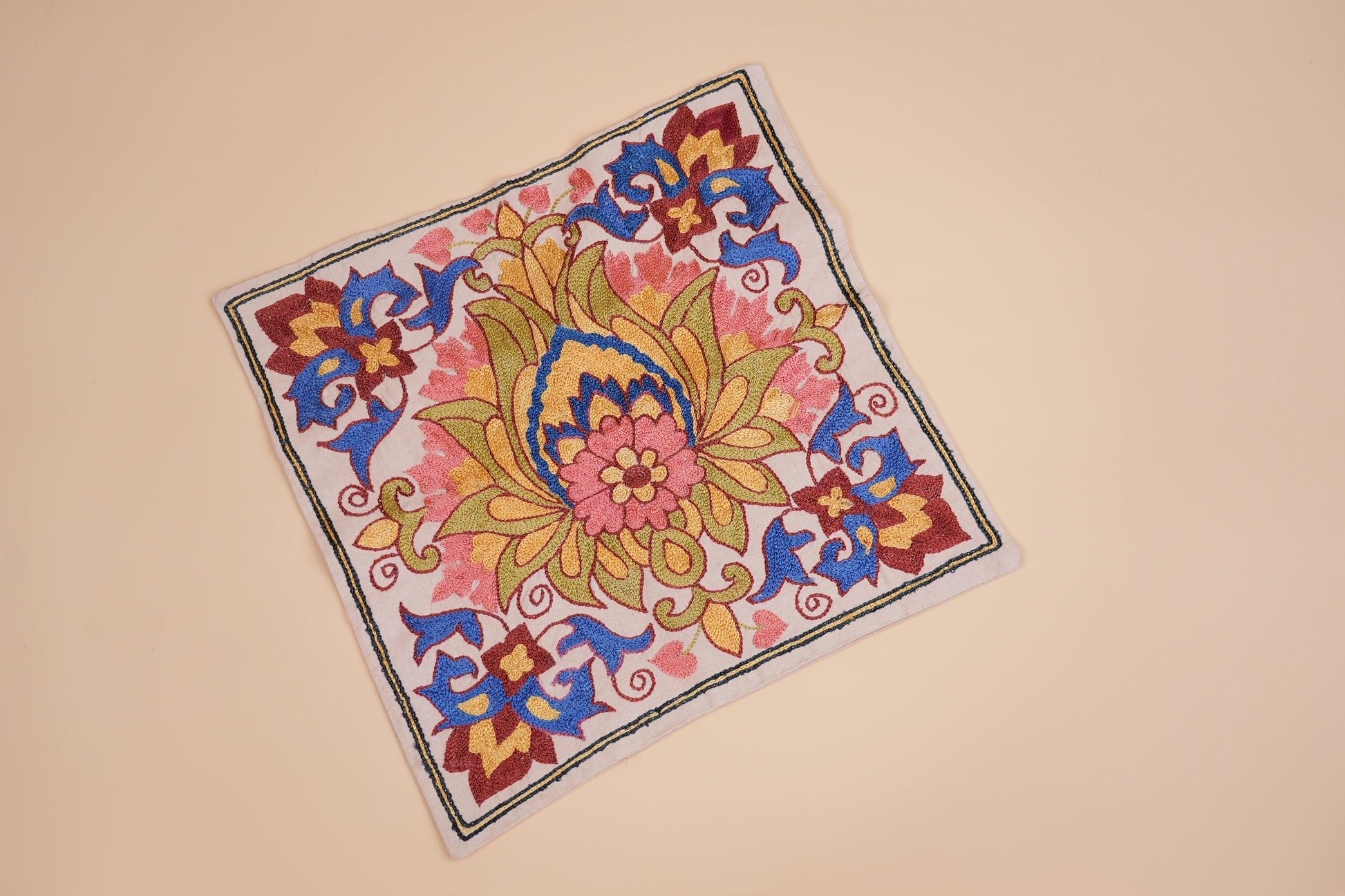 Elevate your home décor with this beautifully hand-embroidered pillow case, inspired by traditional Suzani craftsmanship. Featuring vibrant floral motifs in bold shades of pink, blue, gold, and green, this piece adds a touch of artistry and cultural elegance to any space. Perfect for living rooms, bedrooms, or as a unique gift, this pillow case brings warmth and charm to modern and classic interiors alike.