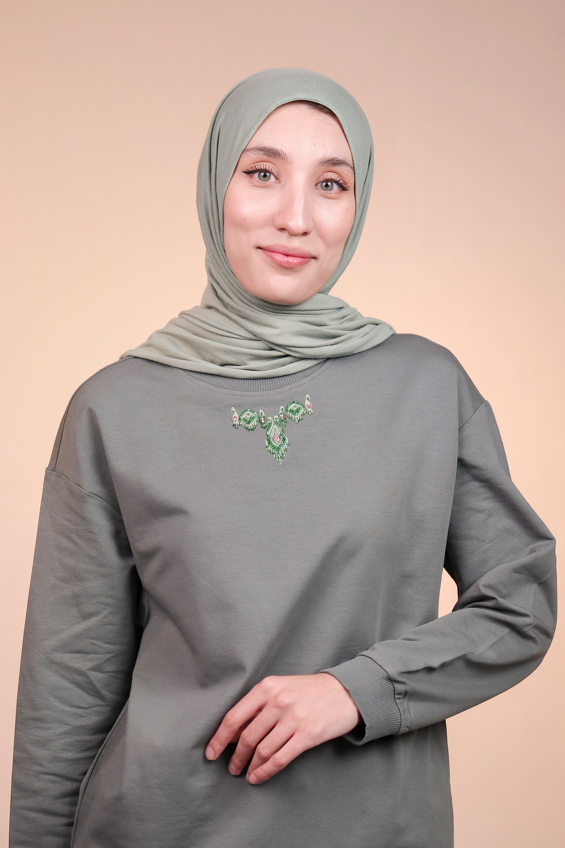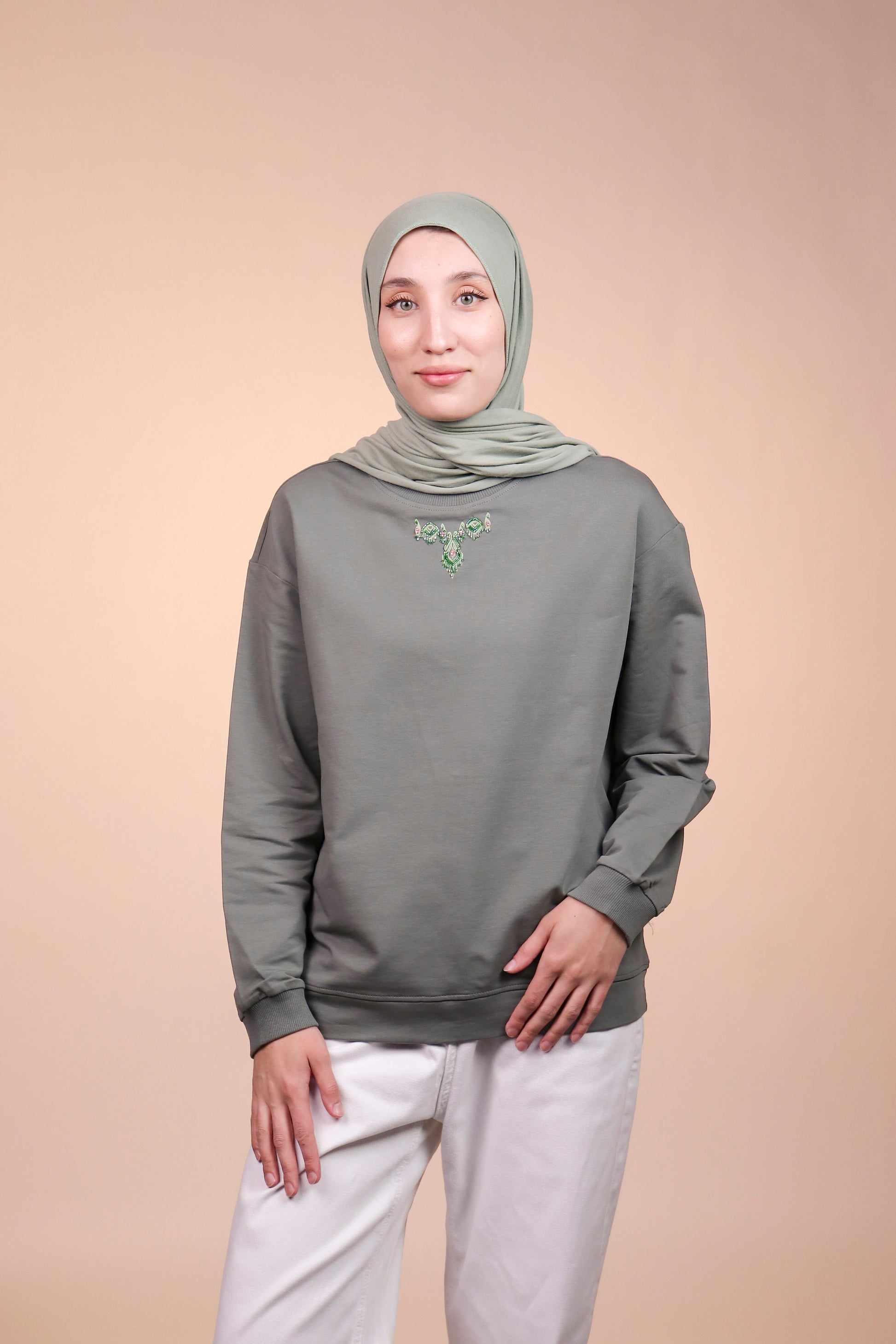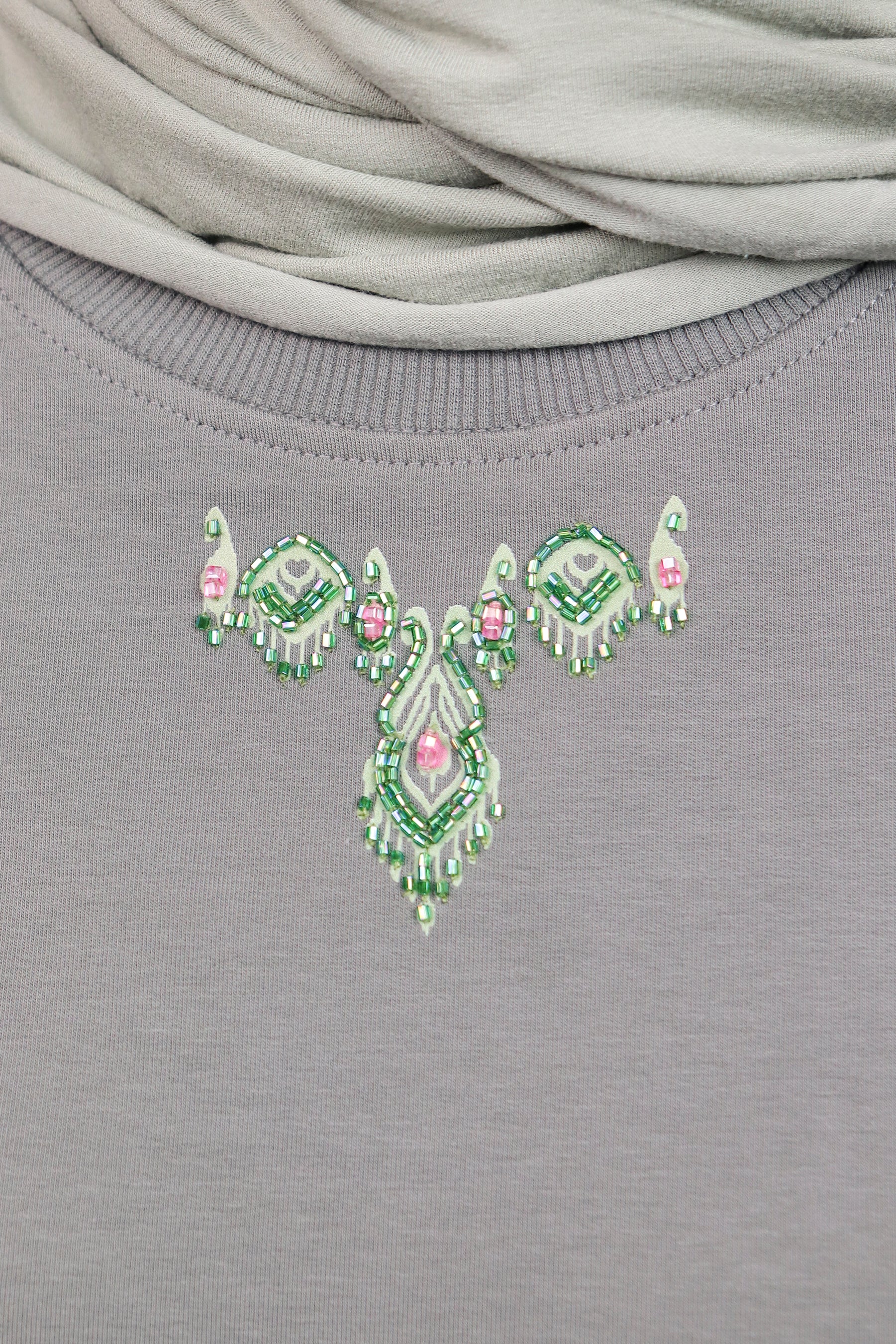 The neckline features a delicate hand-beaded embellishment inspired by traditional jewelry motifs. Green and pink beadwork forms a subtle necklace-like design, adding handcrafted charm and elevating this simple silhouette.