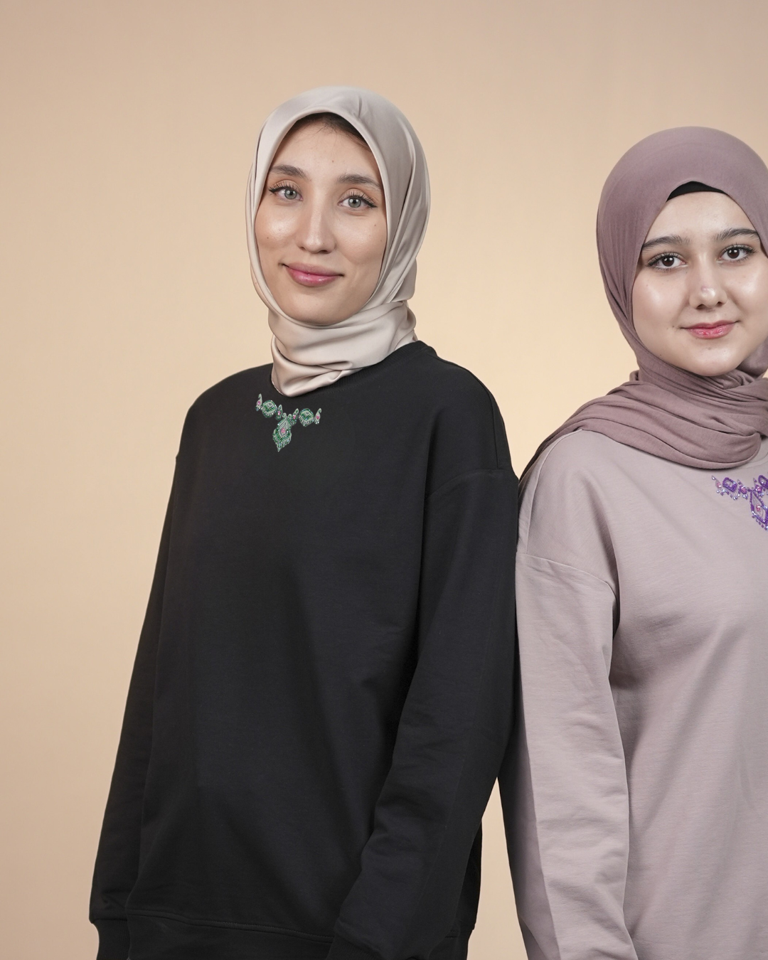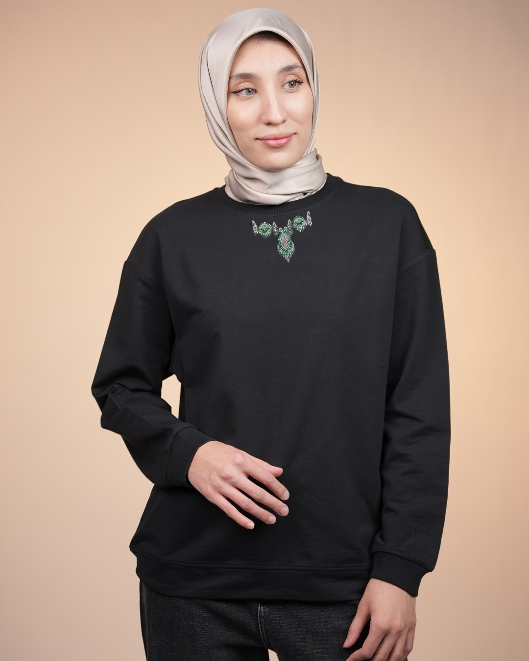 The neckline is adorned with a hand-beaded ornamental motif in refined green and silver tones—an artisanal detail inspired by traditional craftsmanship, thoughtfully reimagined for modern wear. This subtle embellishment adds character to the classic black base, making each piece uniquely Motadil.