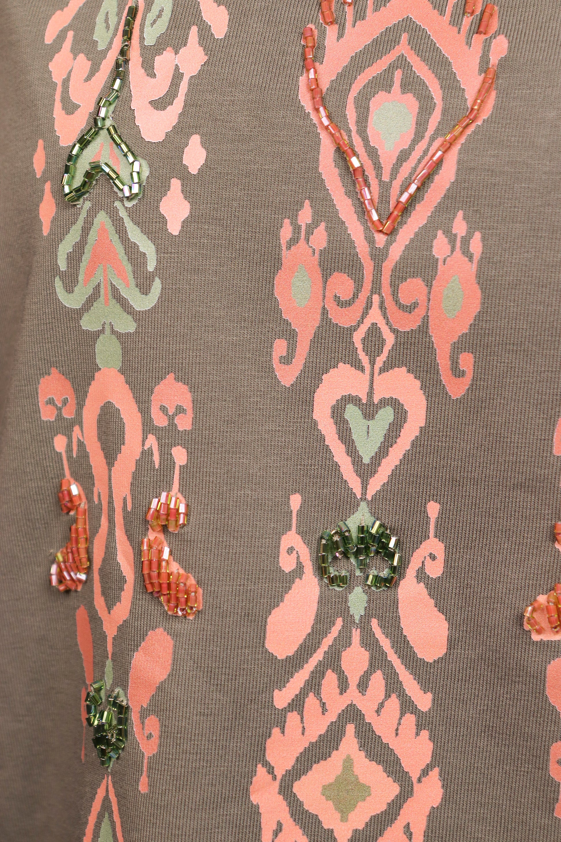 - Color: Olive green with hand-beaded multicolor Ikat motif