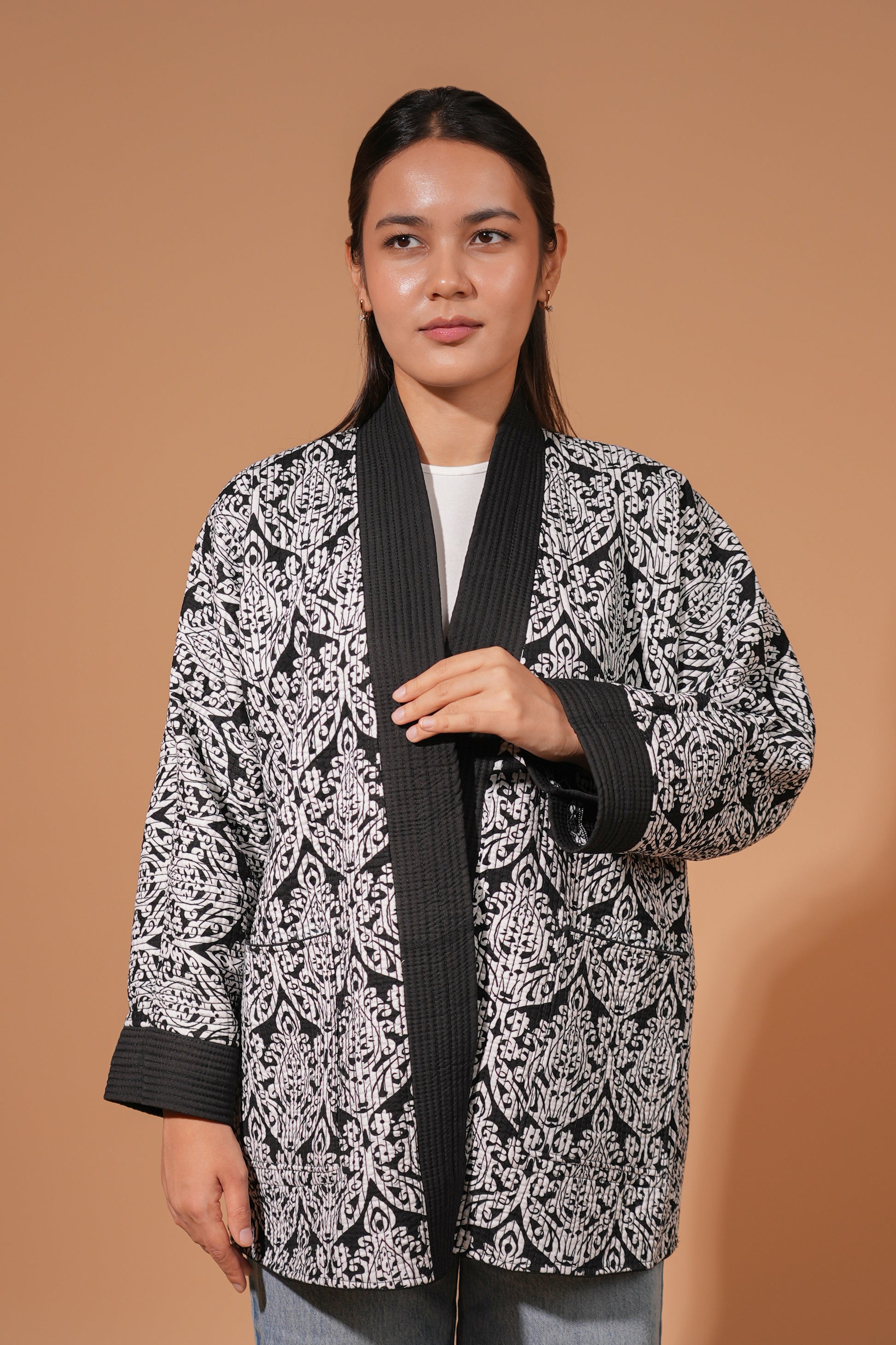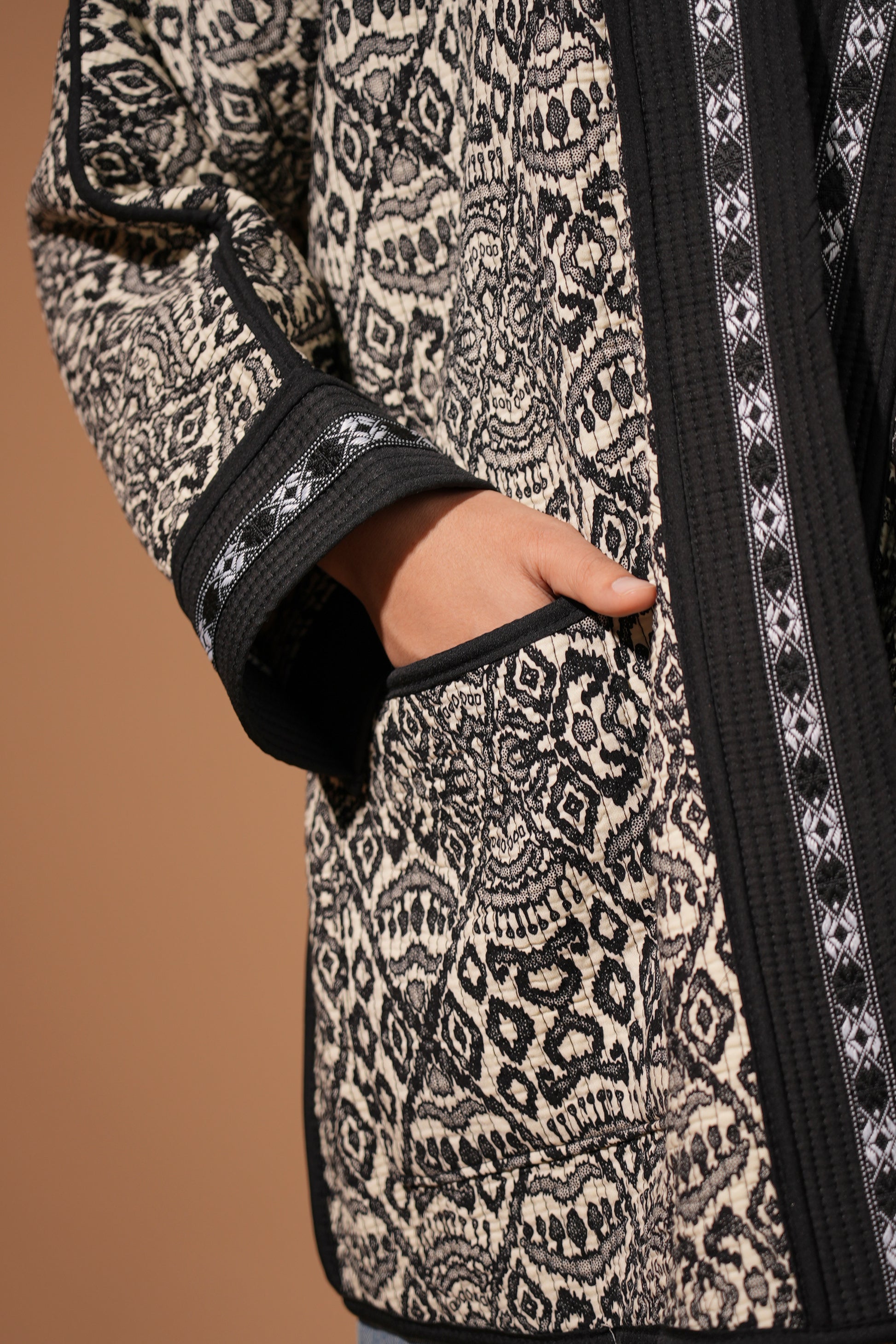 Elevate your style with this reversible short coat, blending modern versatility with timeless tradition. Crafted from 100% cotton woven fabric, it showcases two distinct black and white patterns, allowing you to enjoy two unique looks in one piece. The design is beautifully enhanced with hand-embroidered borders, adding artisanal detail to its refined silhouette, while practical side pockets ensure everyday functionality.