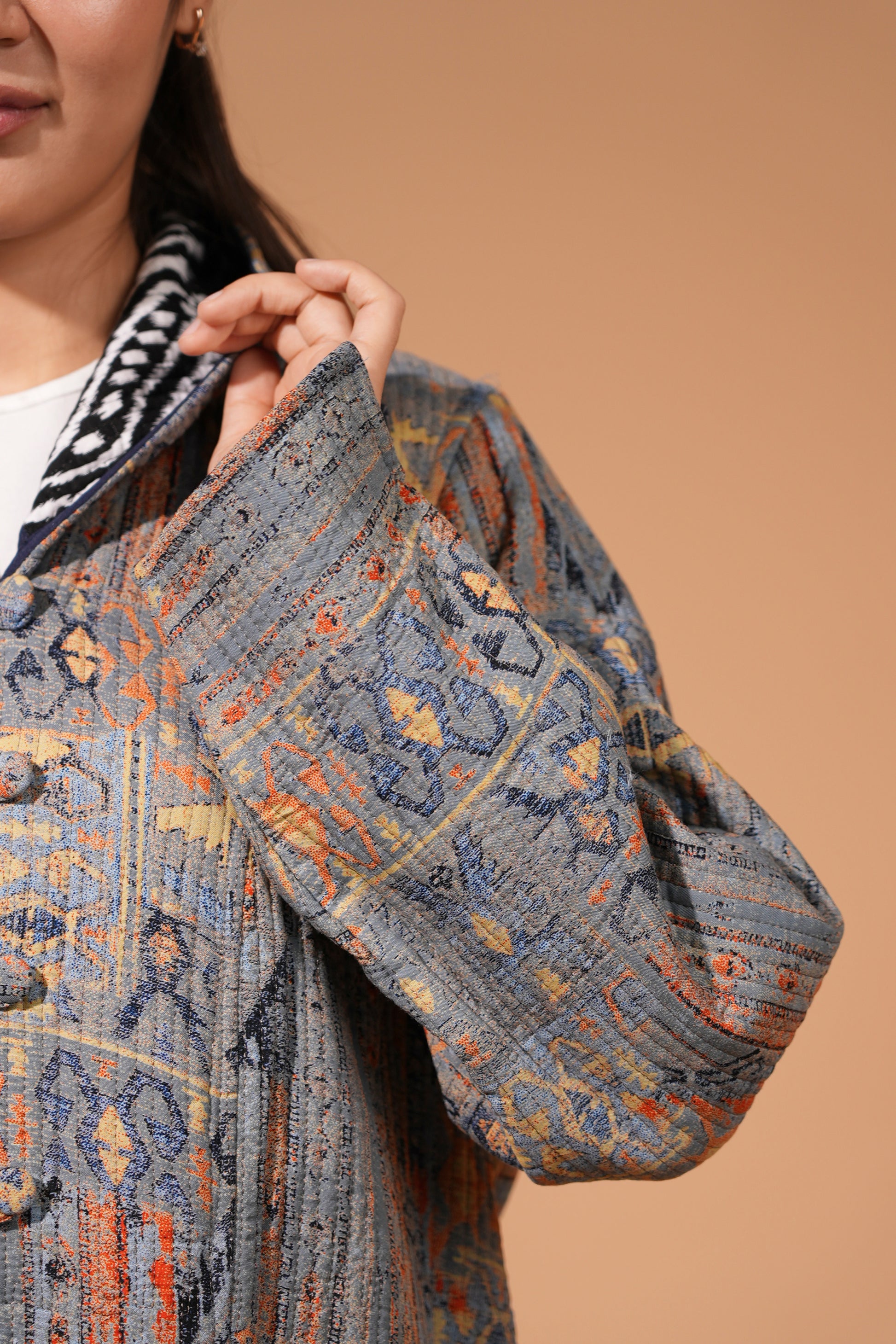 Lightweight yet warm, this coat is perfect for layering in cooler weather while making a distinctive cultural fashion statement. A true embodiment of sustainability, heritage, and modern elegance.