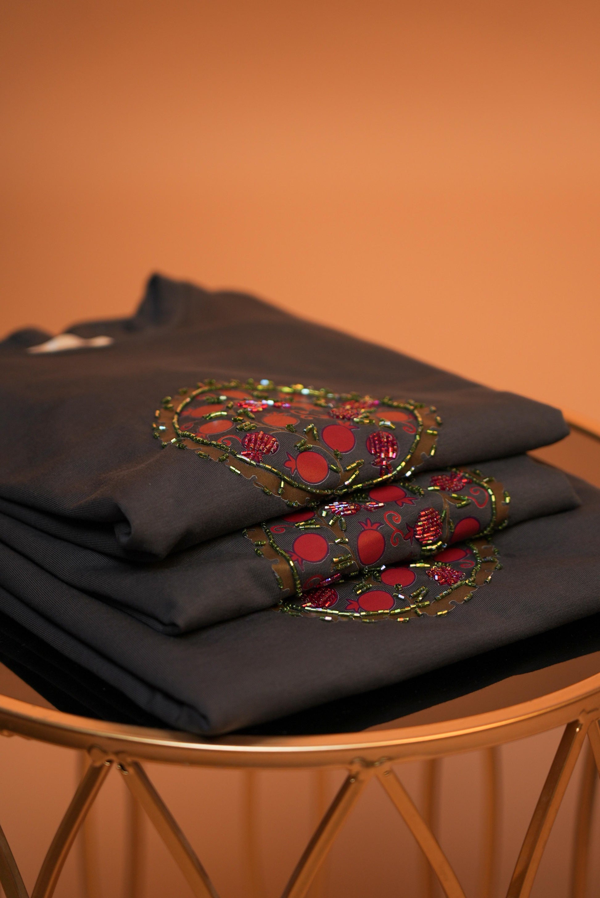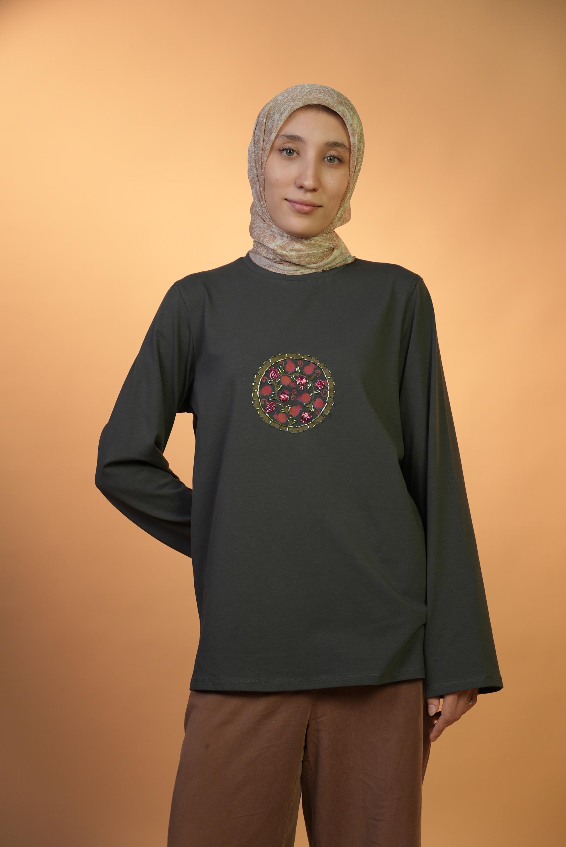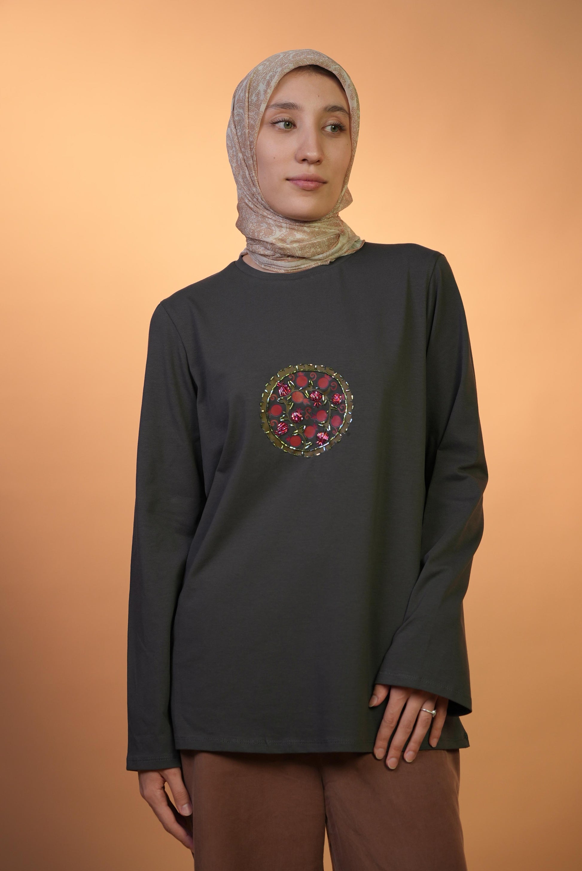 The Suzani Ring - Charcoal cotton longsleeve blends everyday comfort with traditional artistry. Made from 92% cotton and 8% elastane, it provides a soft, breathable feel with a hint of stretch for all-day ease. The deep charcoal base is elevated by a circular Suzani-inspired embroidery in rich tones of red and pink, symbolizing heritage and elegance. Perfect for casual wear or layering, this piece is available in sizes S, M, and L.