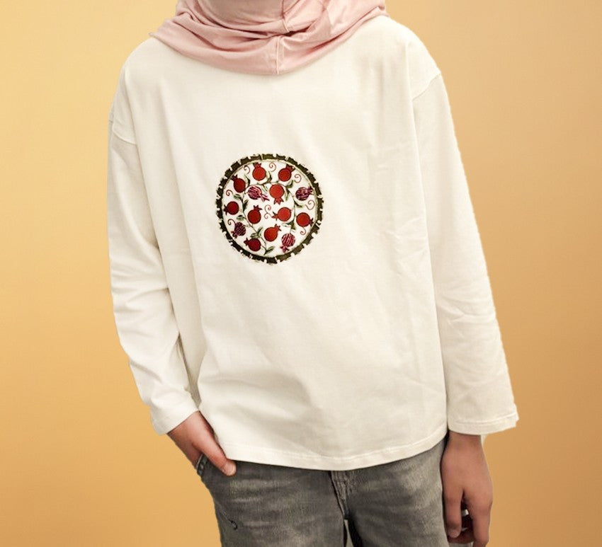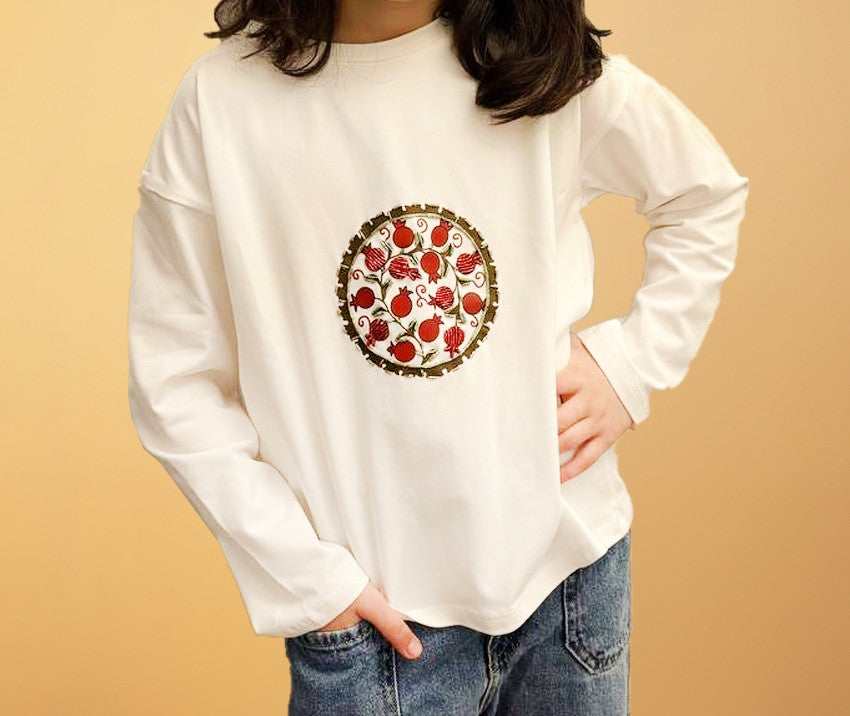 The Suzani Ring - Ivory Girls’ Longsleeve blends timeless tradition with everyday comfort. Crafted from 92% cotton and 8% elastane, this soft and breathable top ensures freedom of movement while keeping its elegant shape. The ivory base is accented with a striking embroidered Suzani ring motif in rich red and green tones, adding a cultural touch of artistry. Perfect for school days, family outings, or festive gatherings, this versatile longsleeve gives girls a stylish way to stay comfortable and unique.
